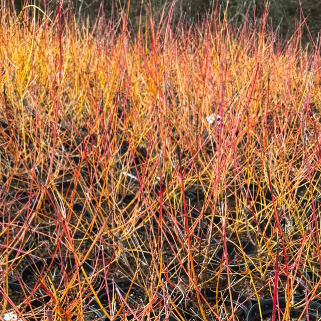 Dereń świdwa 'Midwinter Fire' to wyjątkowy, liściasty krzew ozdobny, który przyciąga uwagę szczególnie zimą dzięki intensywnie czerwonym, pomarańczowym i żółtym pędom. Latem dekoracyjny zielony pokrój uzupełniają białe kwiaty, a jesienią liście przebarwiają się na ciepłe odcienie. Jest niezwykle odporny na mróz, łatwy w uprawie i idealny do ogrodów przydomowych oraz nasadzeń miejskich. Intensywnie wybarwione pędy sprawiają, że krzew przyciąga wzrok nawet w bezlistnym okresie. To krzew, który zapewnia efektowny wygląd przez cały rok. Szczególnie zimą jego ogniste pędy dodają ogrodowi koloru i życia, a wysoka odporność na mróz i choroby czyni go idealnym wyborem zarówno dla początkujących, jak i doświadczonych ogrodników.